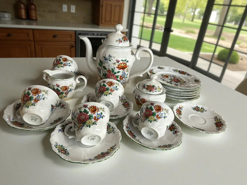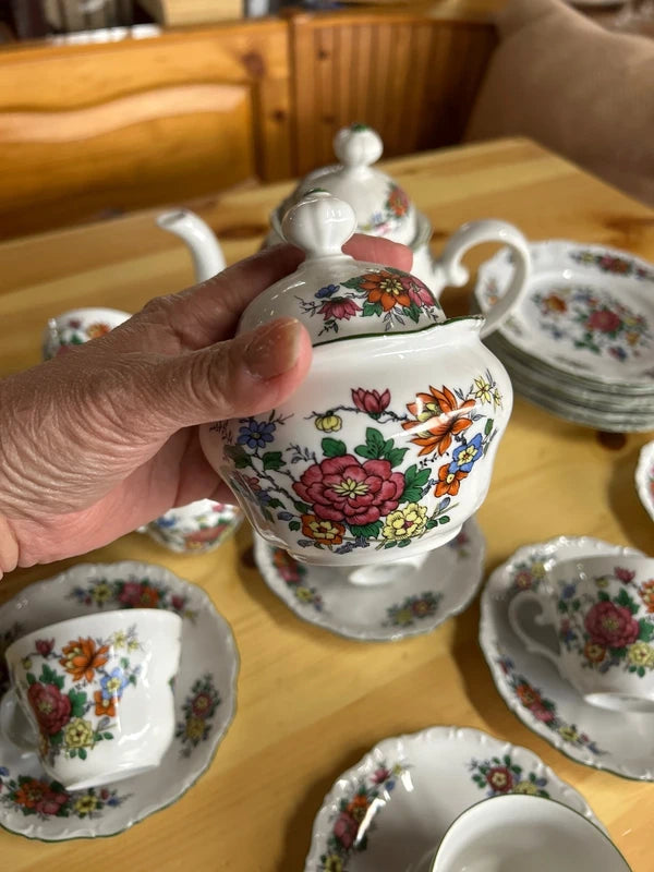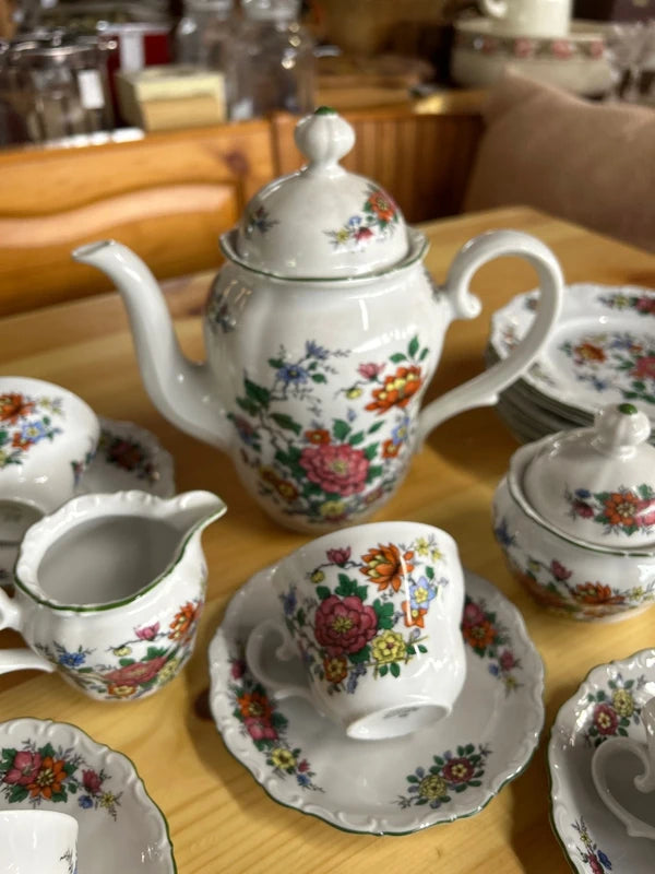 Servizio completo con teiera, zuccheriera, lattiera, 5 tazze e 6 piattini, più ulteriori 6 piatti da dessert. Purtroppo manca una tazza al servizio però è bellissimo comunque.